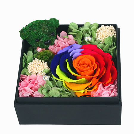 材料包裝: 保鮮花:主材:1只小熊,1朵彩虹玫瑰;配材:繡球;尺寸:15*15*12CM
