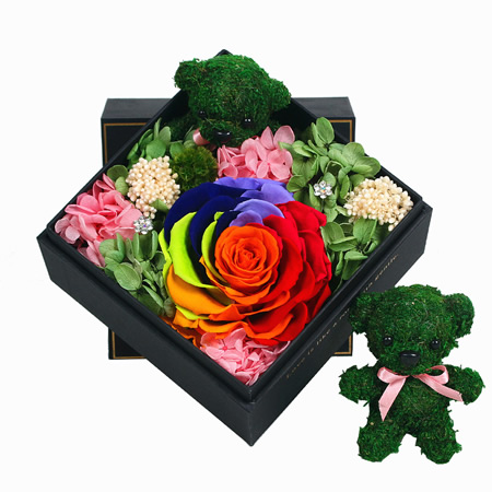 保鮮花:主材:2只小熊,1朵彩虹玫瑰;配材:繡球;尺寸:15*15*12CM