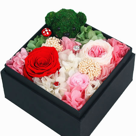 保鮮花:主材:1只小熊,1朵紅玫瑰,1朵粉玫瑰,1朵大衛(wèi)奧斯丁;配材:繡球;尺寸:15*15*12CM