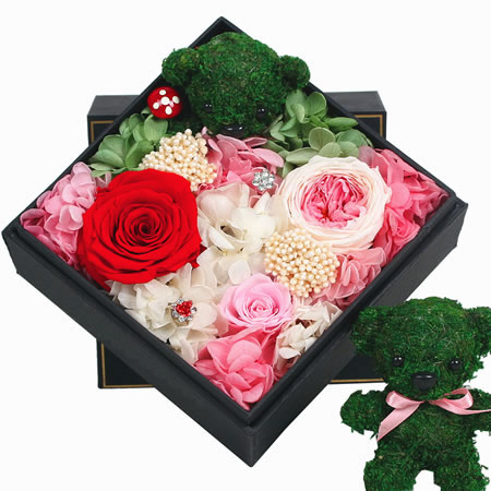 商品簡介:保鮮花:主材:2只小熊,1朵紅玫瑰,1朵粉玫瑰,1朵大衛奧斯。慌洳模豪C球;尺寸:15*15*12CM