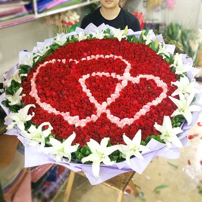 紅玫瑰,白玫瑰999支,19支白百合外圍,白玫瑰擺心心相依造型,綠葉搭配,紫色包裝紙包裝,粉色絲帶扎束