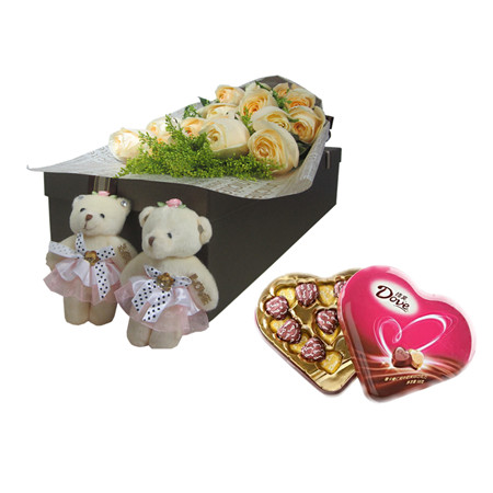 材料包裝: 19支香檳玫瑰 2只小熊 黃鶯搭配 禮盒包裝 加1盒98g德芙巧克力