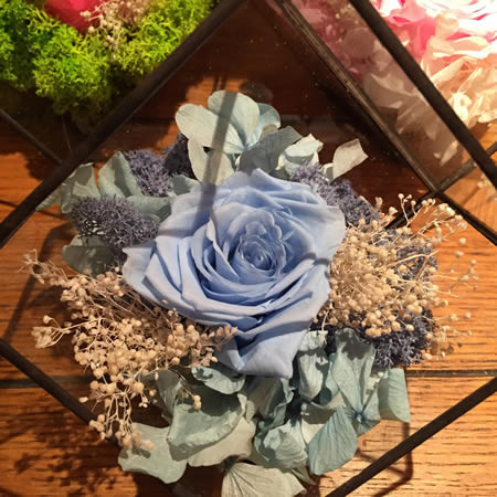 主材:1朵4-5CM玫瑰, 配材:繡球,星星草 尺寸:玻璃盒,10*10*10CM