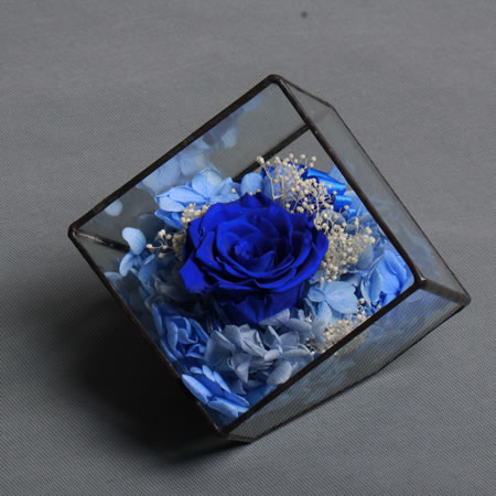 主材:1朵4-5CM玫瑰, 配材:繡球,緞帶,星星草 尺寸:玻璃盒,10*10*10CM