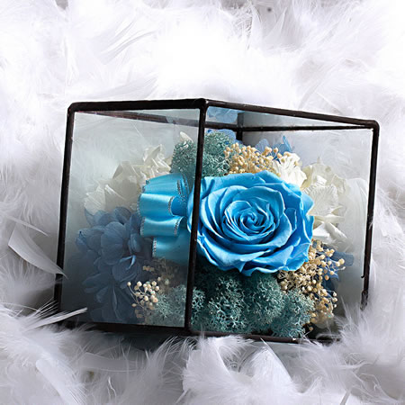 主材:1朵4-5CM玫瑰, 配材:繡球,緞帶 尺寸:玻璃盒,10*10*10CM
