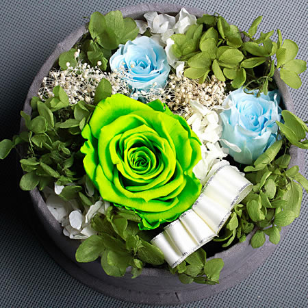 商品簡介:主材:1朵5-6CM玫瑰,2朵2-3CM玫瑰 配材:繡球,星星草,緞帶 尺寸:高帽盒,直徑14*高11CM