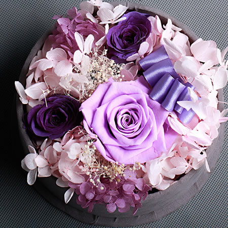 主材:1朵5-6CM玫瑰,2朵2-3CM玫瑰 配材:繡球,星星草,緞帶 尺寸:高帽盒,直徑14*高11CM