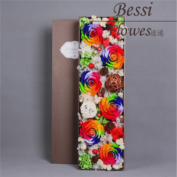 材料包裝: 6朵彩虹永生花 配草搭配 禮盒