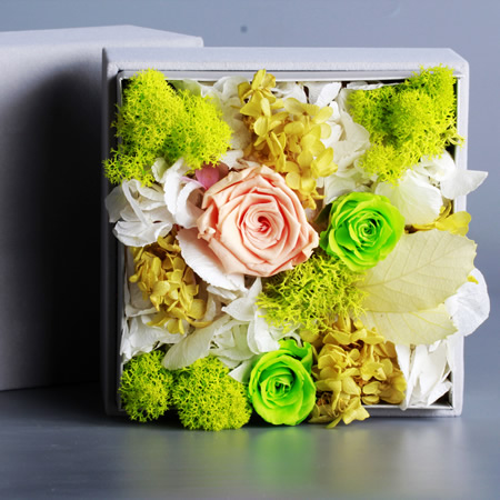 保鮮花:主材:1朵5-6CM玫瑰,2朵2-3CM玫瑰 ;配材:繡球,苔蘚,星星草, 尺寸:天地蓋方盒15*15*12cm