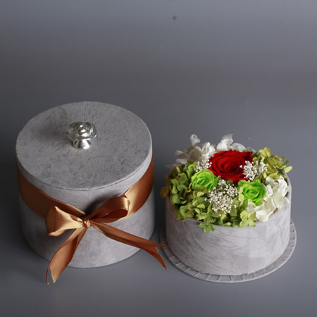 保鮮花:主材:1朵5-6CM玫瑰,2朵2-3CM玫瑰 ;配材:繡球,苔蘚,星星草,緞帶;尺寸:高帽盒,直徑14*高11CM