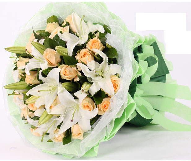 材料包裝: 33支香檳玫瑰,2支多頭白色百合,滿天星黃鶯搭配,白色紗網(wǎng)內襯,淡綠色瓦楞紙包裝,綠色蝴蝶結扎尾