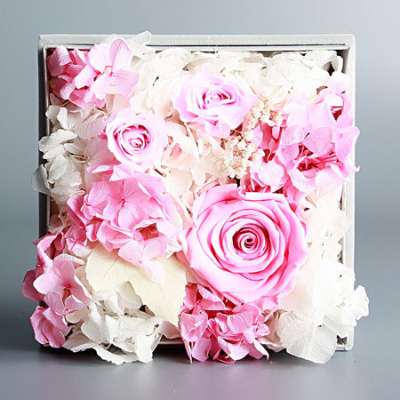 主材:1朵5-6CM玫瑰,2朵2-3CM玫瑰;配材:繡球,滿天星;尺寸:15*15*12cm