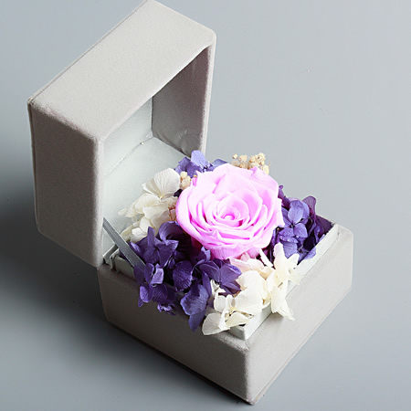 主材:1朵4-5CM玫瑰;配材:繡球,滿天星;尺寸:8*8*7cm盒子