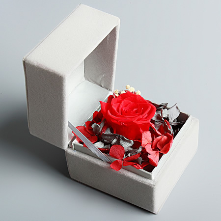 材料包裝: 主材:1朵4-5CM玫瑰;配材:繡球,滿天星;尺寸:8*8*7cm盒子