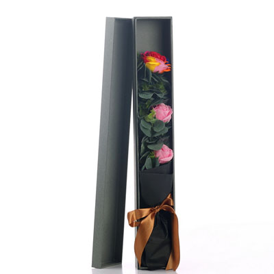 產品簡稱:1朵七彩+2朵粉長條盒花束,材料:一朵巨型七彩,2朵5層香皂花,尺寸:尺寸:65*10*8CM