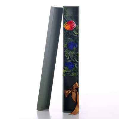 產(chǎn)品簡稱:1朵七彩+2朵藍(lán)長條盒花束,材料:一朵巨型七彩,2朵5層香皂花,尺寸:尺寸:65*10*8CM