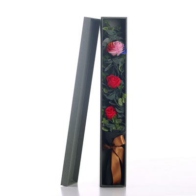 產品簡稱:1朵七彩+2朵紅長條盒花束,材料:一朵巨型七彩,2朵5層香皂花,尺寸:尺寸:65*10*8CM