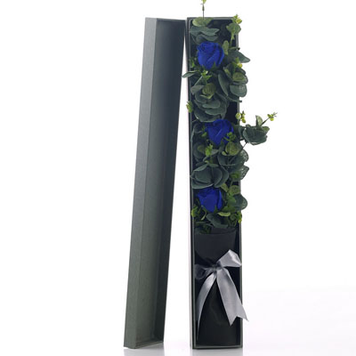 材料包裝: 產(chǎn)品簡稱:3朵藍(lán)色香皂花長條盒花束,尺寸:尺寸:65*10*8CM