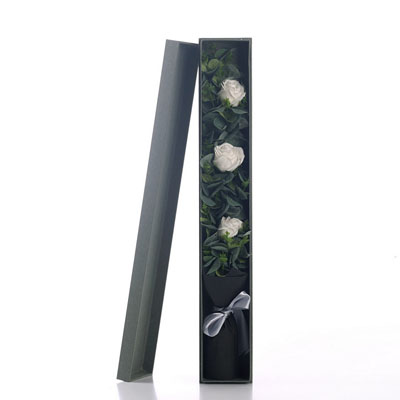 產品簡稱:3朵白色香皂花長條盒花束,尺寸:尺寸:65*10*8CM