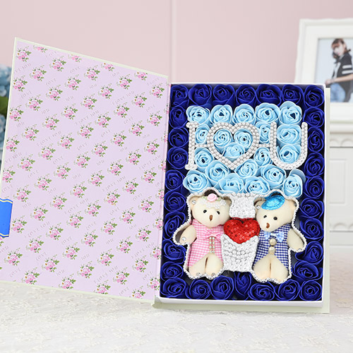 商品簡介:香皂花:51朵書本IU+牽手熊 藍色禮盒