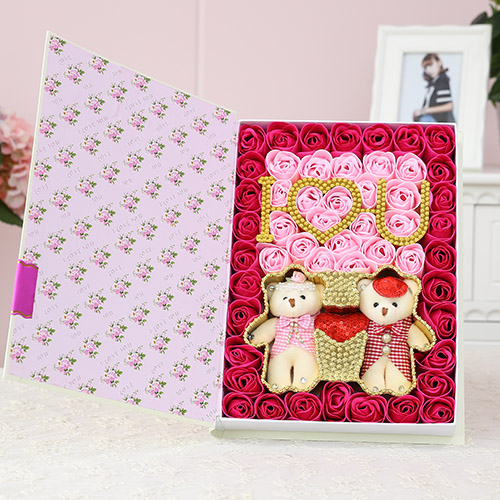 香皂花:51朵書本IU+牽手熊 玫紅色禮盒