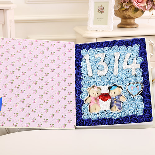 香皂花:99朵書本1314+牽手熊 藍色禮盒