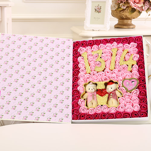 香皂花:99朵書(shū)本1314+牽手熊 玫紅色禮盒