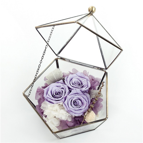 商品簡介:主材:3朵5-6CM玫瑰, 配材:米花,繡球,黃金球,銀葉菊,薰衣草。 尺寸:五星玻璃花房,18X17X16cm