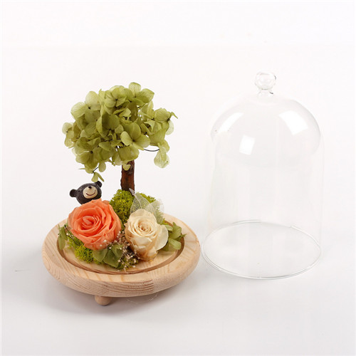 主材:1朵5-6CM玫瑰,1朵3-4CM玫瑰。 配材:1只樹脂熊,繡球,苔蘚,葉脈。 尺寸:玻璃罩,直徑14CM,高20CM
