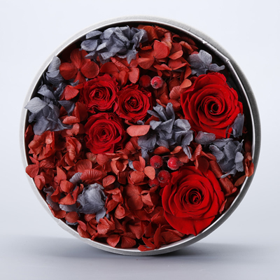 直徑:20.5*11cm 2朵5—6cm進口玫瑰 3朵3—4cm玫瑰 配草:滿天星,繡球