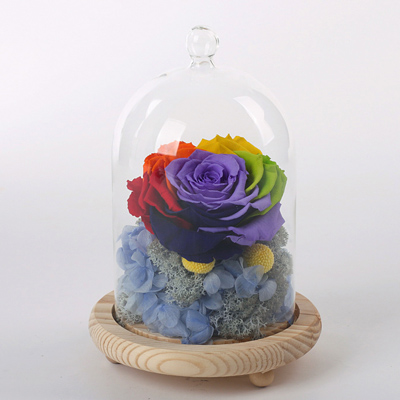 主材:1朵彩虹玫瑰,配材:藍色繡球花,尺寸:玻璃罩,直徑14CM,高20CM