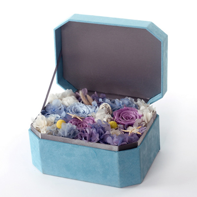 主材:3朵5-6CM進口玫瑰,2朵3-4CM玫瑰。配材:繡球,黃金球,米花等。尺寸:長方八角鹿皮絨禮盒23×17×12。贈送禮品袋