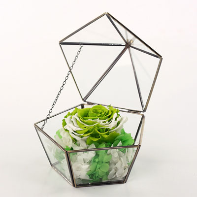 主材:1朵進(jìn)口巨型10CM永生花。配材:繡球。尺寸:五星玻璃花房,18X17X16cm