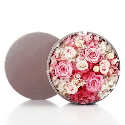 主材:3朵5-6CM玫瑰,4朵3-4CM玫瑰。配材:米花,繡球,黃金球。尺寸:灰色圓絨布盒。20.5*11cm