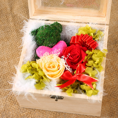 主材:2朵5-6CM玫瑰,1只苔蘚小熊。配材:繡球,羽毛。尺寸:小木盒,15*15*10CM