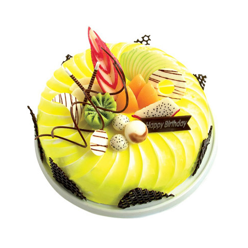 商品簡介:圓形鮮奶水果蛋糕時令水果及巧克力拉絲裝飾,另有巧牌“happy birthday”
