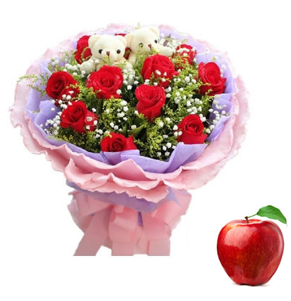 商品簡介:11紅玫瑰+2只卡通小熊+1個平安果,黃鶯滿天星點綴,精美圓形包裝