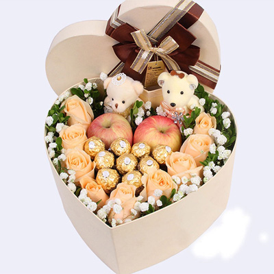 9朵香檳玫瑰+9顆巧克力+2個(gè)平安果+兩個(gè)小熊,精美禮盒(禮盒顏色隨機(jī),以當(dāng)?shù)匕l(fā)貨為準(zhǔn))