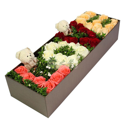 材料包裝: 33朵各色玫瑰+2個小熊,精美禮盒(禮盒顏色隨機,以當地發貨為準)
