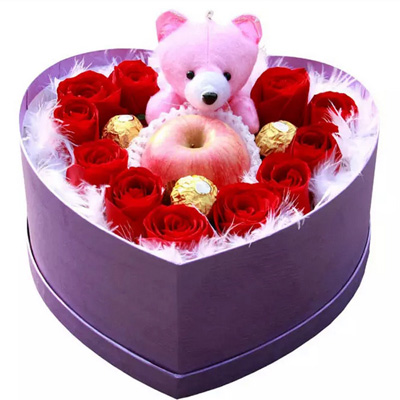 11朵紅玫瑰+3顆巧克力+1個平安果+1個小熊,精美禮盒(禮盒顏色隨機,以當地發貨為準)