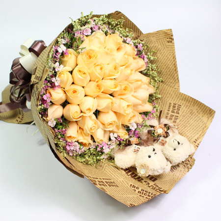 商品簡介:花材:33支香檳玫瑰,2只小熊,搭配情人草,石竹梅;包裝:英文報紙包裝,蝴蝶結扎尾