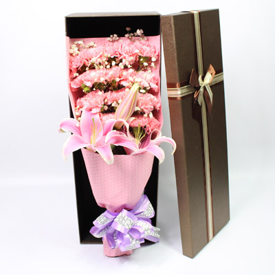 花材:19支粉色康乃馨加一個多頭粉色百合,搭配滿天星,禮盒包裝(禮盒顏色隨機,以當地發貨為準)