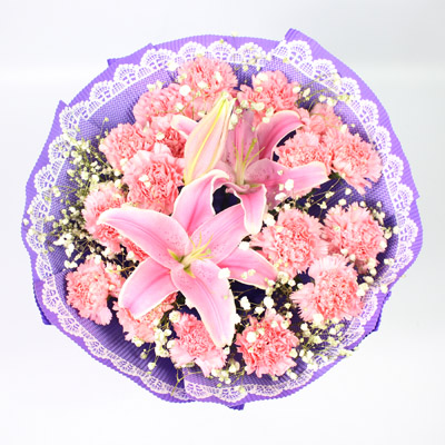 花材:19支粉色康乃馨加一支百合,搭配滿天星,紫色皺紋紙圓形包裝