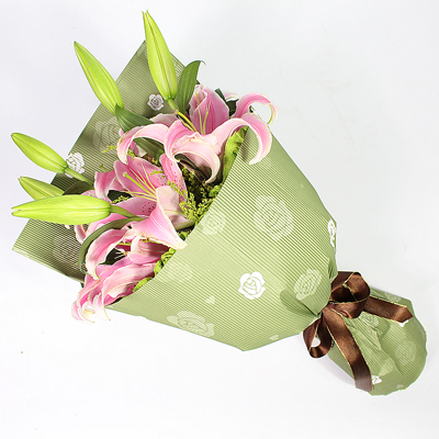 商品簡介:花材:3支多頭粉色百合,搭配黃鶯,包裝:綠色瓦楞紙包裝,絲帶結扎