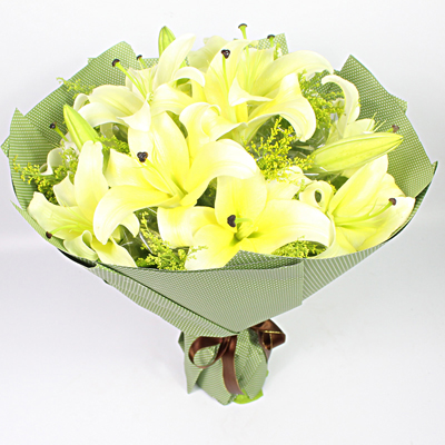 花材:4支多頭黃百合,搭配黃鶯,包裝:綠色包裝紙圓形包裝,絲帶扎尾