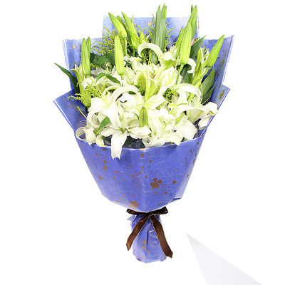 花材:6支多頭白百合,搭配黃鶯,包裝:藍(lán)色包裝紙扇形包裝,絲帶結(jié)扎