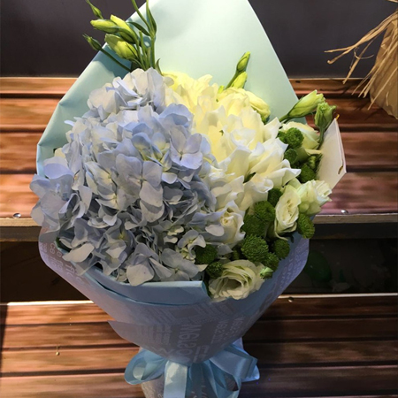 商品簡介:11支白玫瑰 1支藍繡球 配草搭配 淡藍色包裝紙扇形包裝