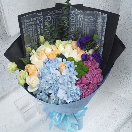 11只紫玫瑰 11只香檳玫瑰 11只白玫瑰 1只藍色繡球花 配草搭配 淡黑色包裝紙扇形包裝