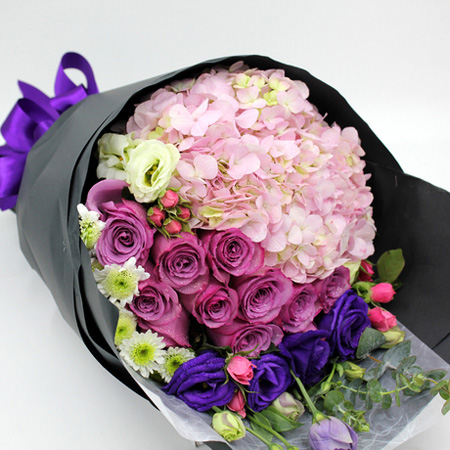 商品簡介:11只紫色玫瑰 一支粉色繡球 配草搭配 墨綠色包裝紙扇形包裝