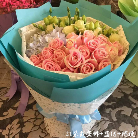 商品簡介:21支戴安娜玫瑰 1支藍(lán)色繡球花 桔梗花 配草搭配 藍(lán)色包裝紙配白色紗網(wǎng) 圓形包裝